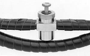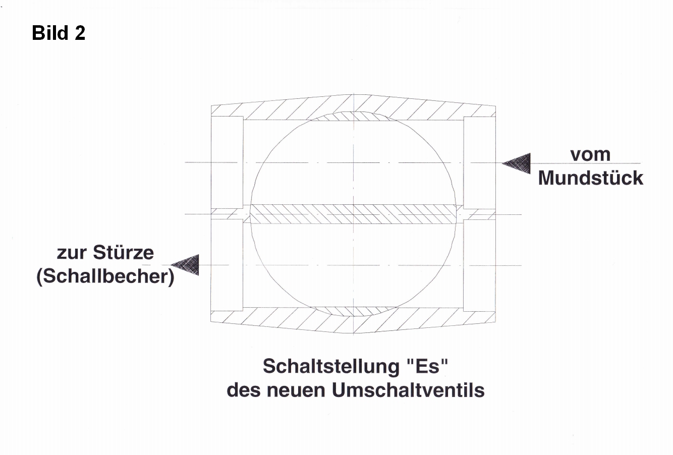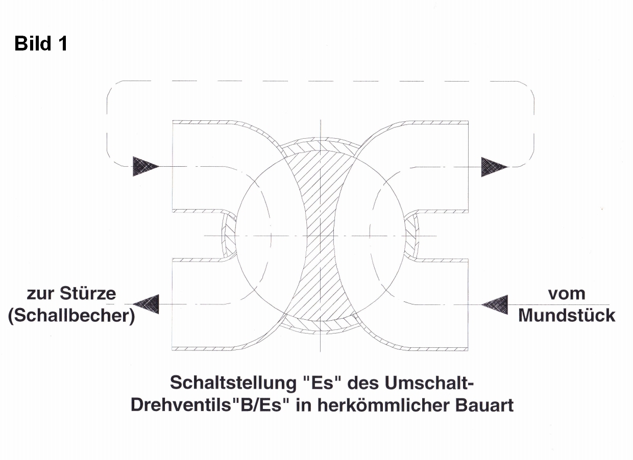 In der Mensurierung, den Blechstärken und in der Verarbeitung wurden die Instrumente im Rahmen des Möglichen optimiert. Nur das bis heute von allen Herstellern verwendete Umschalt-Drehventil (s. Bild 1) mit seinen strömungstechnischen Nachteilen, blieb uns erhalten. In der Stellung Es-Dur hat dieses Ventil zwei Strömungsumlenkungen von jeweils 180°, die das Ansprechverhalten und den Naturhorncharakter negativ beeinflussen. Diese Nachteile werden besonders. von „französisch“ beeinflussten Bläsern sowie von Bläsern aus der Reiterszene bemängelt (siehe hierzu Prof. Bartels in Zeitschrift Wild und Hund 22/92, Seiten 104 u. 105).